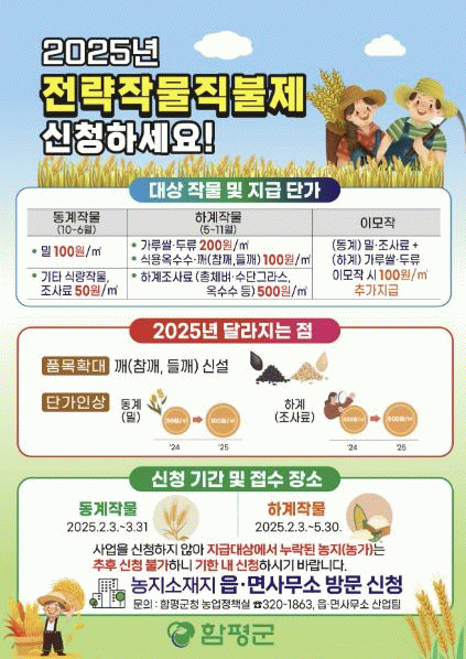 함평군은 11일 “전략 작물 직불제(하계작물), 논 타작물 재배 지원사업, 벼 재배면적 조정제도 등 각종 지원을 희망하는 농업인은 오는 5월 30일까지 농지 소재지 관할 읍·면사무소에서 신청할 수 있다”고 밝혔다.