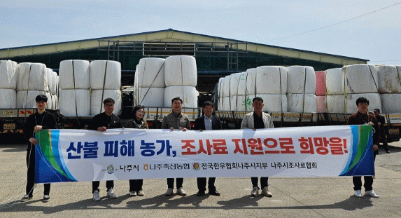 14일 나주시에 따르면 전국한우협회 나주시지부, 나주축산업협동조합, 나주시 조사료경영체협의회는 최근 1200만원 상당 볏짚 곤포 144롤을 경북지역 축산농가에 전달했다.