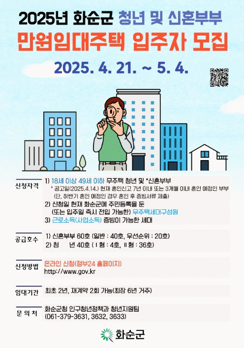 이번 2025년도 모집 대상은 작년과 마찬가지로 공고일 기준 18세 이상 49세 이하의 청년 또는 신혼부부로 지원신청일 현재 화순군에 주민등록을 두고 있거나, 입주일 즉시 전입할 수 있는 전입 예정자여야 한다.