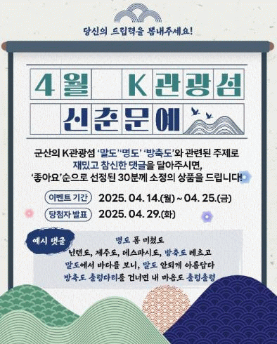 시는 4월 25일까지 군산 k-관광섬 공식 인스타그램(gunsan_k_island/군산 k-관광섬) 계정에서 신춘문예 온라인(SNS) 행사를 진행한다고 밝혔다.