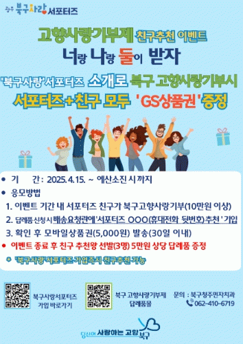 이번 이벤트는 고향사랑기부제 기부 활성화를 위해 마련한 것으로 북구사랑 서포터즈의 추천으로 북구에 10만 원 이상을 기부하면 추천자와 기부자 모두에게 GS모바일 상품권 5천 원권을 증정한다.