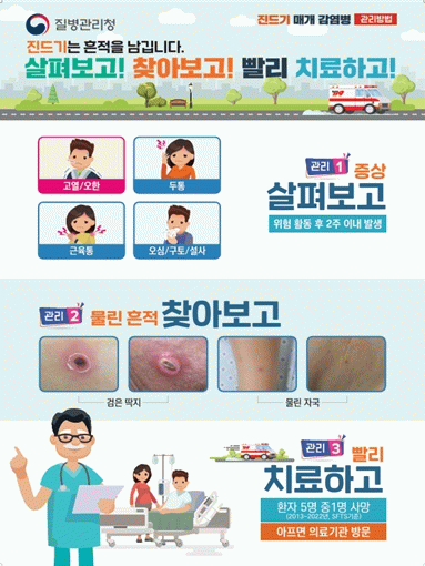 특히, 치사율이 높은 중증열성혈소판감소증후군(SFTS)은 4월부터 10월까지 주로 발생하고 있고, 6월에서 10월에 많이 집중되어 있다. 매개체인 참진드기는 유충부터 성충에 이르기까지 흡혈을 하며, 감염될 경우 치사율이 12~47% 정도로 높아 ‘살인진드기’라는 악명을 가지고 있어 야외활동 시 더욱 주의가 필요하다. 쯔쯔가무시증은 연중 발생하며 10월에서 11월에 집중 발생하고 있다.