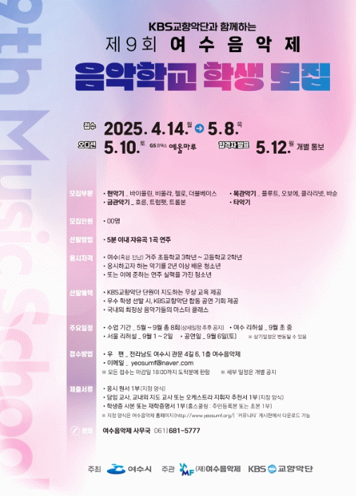 한편, ‘여수음악제 음악학교’는 (재)여수음악제와 KBS교향악단이 공동 주관하는 교육 프로그램으로, 지난 2017년 시작 이래 전남 지역 청소년들에게 실기 중심의 체계적인 음악 교육과 합주 경험을 제공해 왔다.