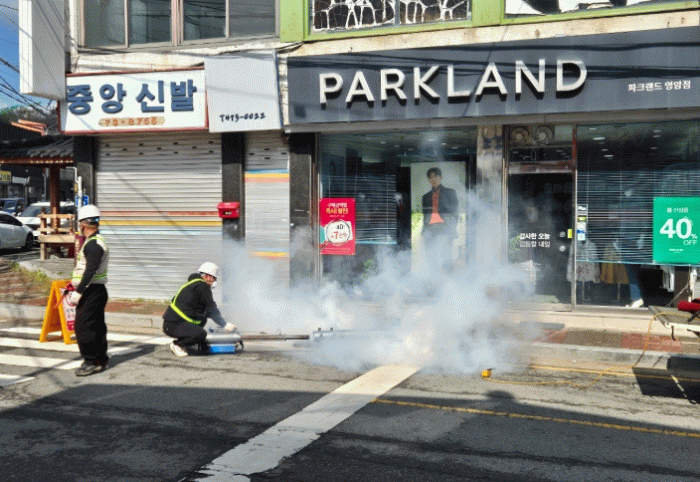 영암읍 시가지 820m 구간 빗물·하수관의 깔따구 제거를 위해 휴대용 방역소독기, 고압 송풍기를 연결해 관로 깊은 곳까지 소독제의 분사량을 그대화하는 ‘가열 연막 공간 살포’ 방식으로 소독하고 있다.