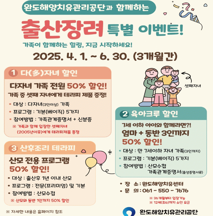 산후조리 중인 산모와 동반 1인까지 50%를 할인한다.