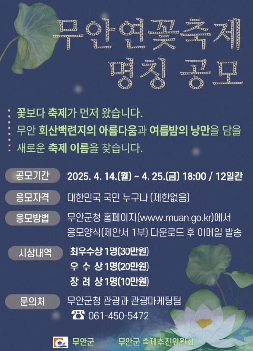 박문재 무안군 축제추진위원회 위원장은 “연꽃이 피기 전 축제가 열리다 보니 관광객들의 기대와 현장 간의 차이를 줄이기 위해 축제 명칭을 새롭게 만드려고 한다”며 “전국 누구나 참여할 수 있는 공모전을 통해 참신하고 매력적인 이름을 발굴하겠다”고 밝혔다.