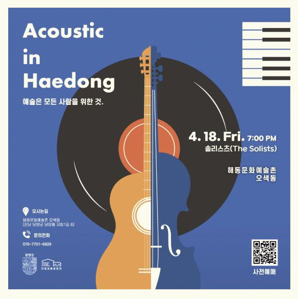 재단 관계자는 “어쿠스틱 인 해동 공연을 시작으로 지역문화예술 수준 향상을 위해 공연·전시·교육 등 다양한 콘텐츠로 지역민과 함께하겠다.”며, “재단에서 추진하는 행사에 많은 관심과 참여를 바란다.”라고 말했다.