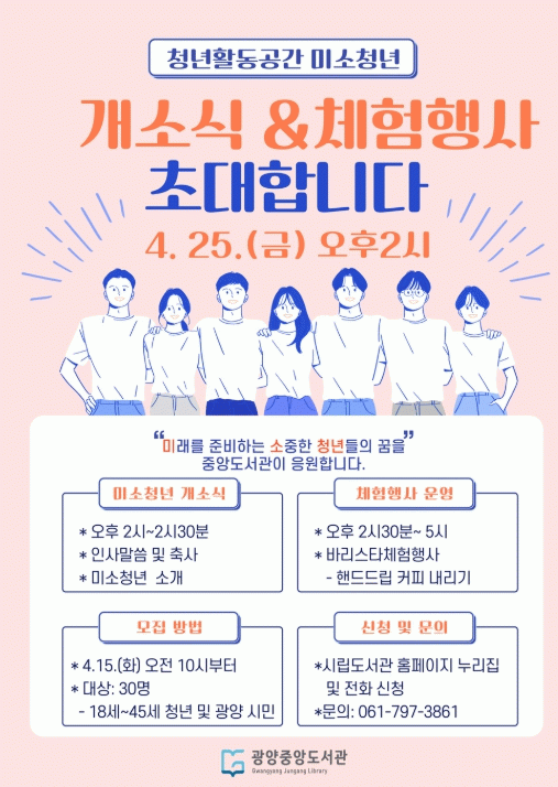 김미라 광양시 도서관과장은 “청년들이 자유롭게 활동할 수 있는 문화․창의 공간을 제공하는 것은 도서관의 중요한 사회적 역할”이라며 “지역 청년들이 ‘미소청년’에서 다양한 아이디어를 발굴하고 창의적인 활동을 펼치길 기대한다”고 말했다.