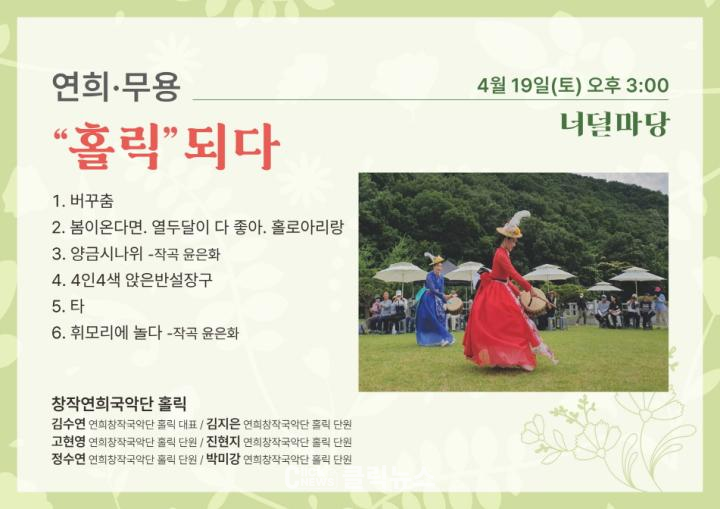 이번 전통문화관 토요 상설공연은 ‘창작연희국악단 홀릭’과 함께 전통의 장단, 아름다운 춤의 선, 리드미컬한 북소리가 어우러진 매력적인 무대로 관객들을 찾아간다.