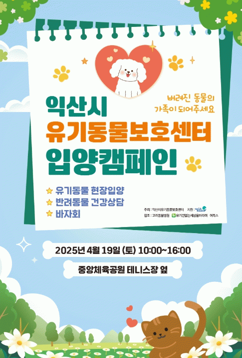 익산시는 오는 19일 중앙체육공원에서 '2025 상반기 유기동물 입양·홍보 캠페인'을 진행한다고 16일 밝혔다.