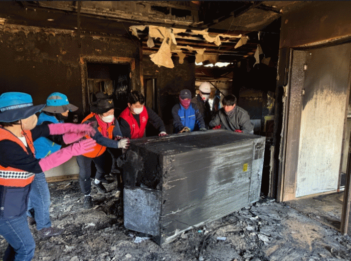 현장에서는 불에 타버린 가전제품, 가구, 생활 폐기물 등 약 5톤(t)가량의 잔해를 정리하고 분리수거 및 청소 작업을 집중적으로 진행했다.