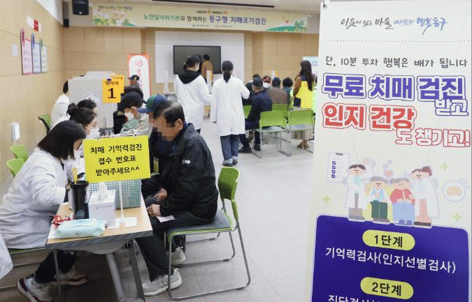 특히 동구치매안심센터에서는 치매 인지 선별 검사 결과 인지 저하가 의심될 경우 치매 정밀검사(신경 심리)를 지원하고, 정밀검사 결과에 따라 필요시 협약병원 의뢰 및 치매 조기 검진비도 지원할 방침이다.