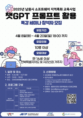 남원시 관계자는 “앞으로도 시민들이 미래 기술을 보다 쉽게 배우고, 일상생활 속에서 적극적으로 활용할 수 있도록 다양한 프로그램을 지속적으로 추진하겠다”며, “특히 SW/ICT 특강은 분기별로 진행될 예정이며, 생성형 및 협업형 인공지능 분야에 중점을 두고 단계적인 교육 과정이 운영될 계획”이라고 밝혔다.