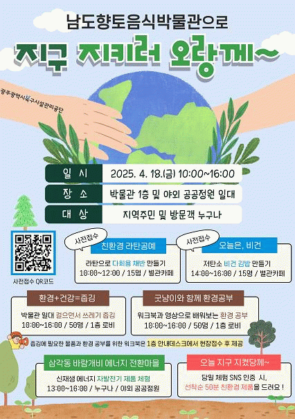 지구의 날은 환경 오염 문제의 심각성을 일깨우기 위해 제정한 날로 남도향토음식박물관은 기후 변화의 심각성을 인식하고 개인의 지속적인 실천 독려하기 위해 삼각동 바람개비 에너지 전환마을, 북구청 청소행정과 등과 협력하여 남녀노소 누구나 참여할 수 있는 다양한 프로그램들을 운영한다.