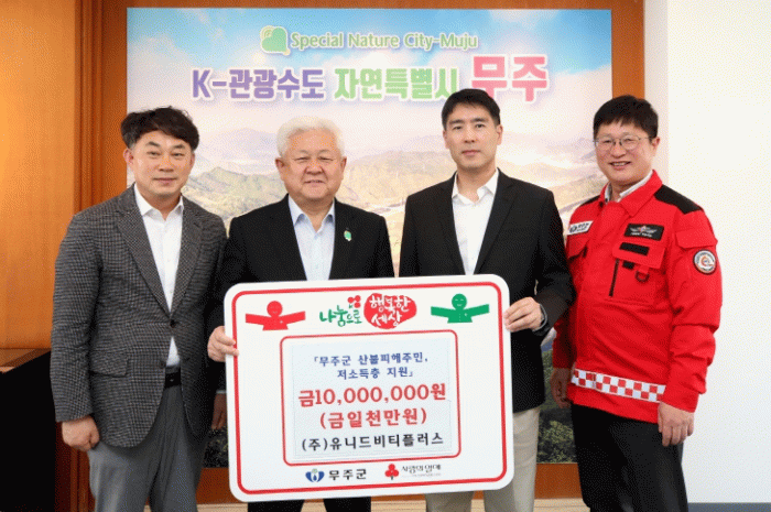 한상준 대표는 “무주군과는 지난해 청소년시설의 마루 시공을 지원하면서 인연을 맺었는데 얼마 전 산불이 발생했다는 소식을 듣고 굉장히 안타까웠다”라며 “성금은 유니드비티플러스 임직원들이 한마음이 돼 마련한 것인 만큼 피해 주민들의 재기를 돕고 또 무주지역에 거주하는 어려운 형편의 주민들을 지원하는 데 요긴하게 쓰이길 바란다”라고 전했다.