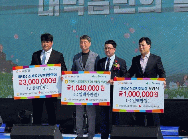 기념식에 앞서 대덕읍 지역사회보장협의체에 도서마을 오광식씨, 천관농업협동조합, 대덕읍 조사료연결체협의회에서 5백만원의 성금을 기탁했다.