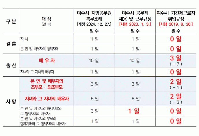 현재 여수시 공직자 별 복무규정에 따르면, 지방공무원은 배우자 출산 시 10일, 자녀 사망 시 5일의 휴가가 보장되며, 공무직 근로자는 자녀 사망 시 공무원과 동일하게 5일이 부여되지만, 기간제근로자는 배우자 출산 시 3일, 자녀 사망 시 2일만 허용되고 있다.