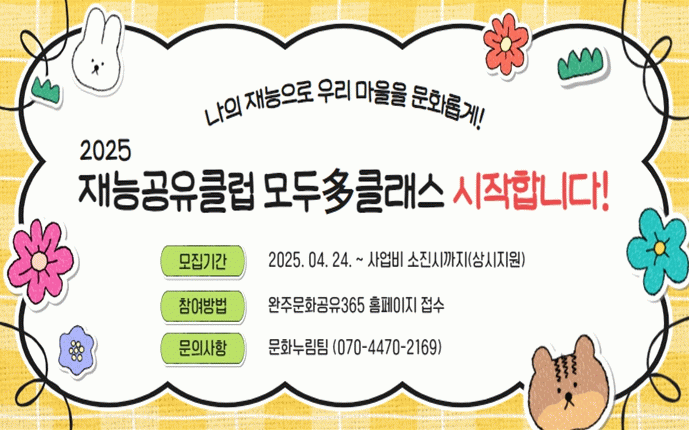 이를 위한 클래스 개설 신청부터 참여자 모집, 결과 보고 등은 모두다클래스 온라인 플랫폼인 ‘완주문화공유365’ 홈페이지에서 이루어지며, 클래스 개설 신청 후 승인 과정을 거친 개설자에게는 클래스 내에서 소모할 수 있는 소모품에 한해 1인 최대 3만 원씩, 최대 20만 원의 재료비가 지원된다. 아울러, 해당 클래스에 참여하고 싶은 참여자는 홈페이지에서 회원가입 후 참여 신청하면 된다.