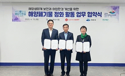 이날 협약식은 협약식은 해양 생태계 보전과 지속 가능한 어업 환경 조성, 2026 여수세계섬박람회 홍보 등을 위한 것으로 정덕영 여수시 해양수산국장을 비롯해 진주태 롯데마트 부문장, 이미경 환경재단 대표, 시 관계자 등이 참석했다.