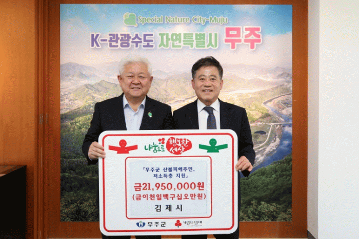 모금에 동참했던 공무원 1,089명을 대표해 무주군을 찾은 정성주 시장은 “갑작스럽게 발생한 산불로 인해 많이 놀라고 아직도 힘든 시간을 보내고 계실 주민 여러분께 따듯한 위로가 되면 좋겠다”라며 “오늘의 인연이 지역 간 협력의 발판이 돼서 무주군과 김제시의 지속 가능한 발전을 이끌어내길 바란다”라고 전했다.