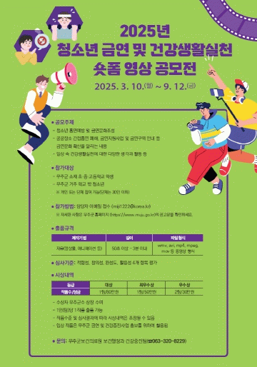 이번 공모는 성장기 청소년들의 금연 및 건강생활 실천을 도모하기 위해 추진하는 것으로, 무주군 소재 초·중·고등학교 재학생을 비롯한 무주군 거주 학교 밖 청소년 등 누구나, 개인 또는 30인 이하의 단체로 참여가 가능하다.