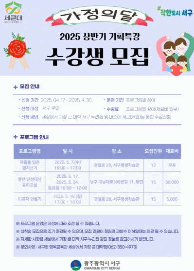 ‘세상에서 가장 큰 대학, 서구’에서 마련한 이번 특강은 ▲부모님에게 선물할 ‘특별한 카네이션 꽃바구니 만들기’ ▲마음을 담은 ‘편지쓰기 교실’ ▲사랑하는 가족들을 위한 ‘아빠 요리교실’ ▲부부를 위한 ‘디퓨저 만들기’ 등 가족 간 소통과 따뜻한 가족 사랑을 체감할 수 있는 다양한 프로그램으로 구성됐다.
