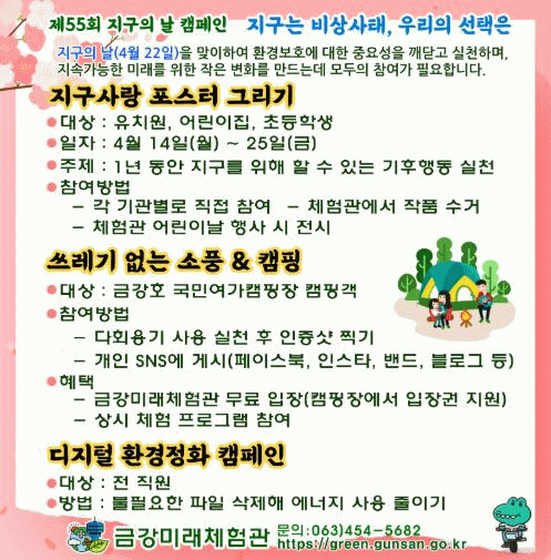 김현숙 기후환경과장은 “올해로 55주년을 맞는 이 특별한 날, 전 세계 10억 명 이상의 사람들이 환경보호를 위한 다양한 활동에 참여한다. 이번 캠페인을 통해 우리의 생활방식을 돌아보고, 지속 가능한 미래를 위한 작은 변화를 만드는 데 동참해 보는 기회가 되길 바란다.”라고 말했다.