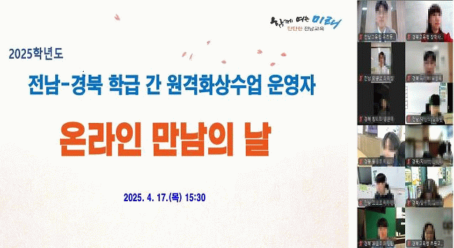 이와 관련, 지난 17일에는 ‘전남-경북 학급 간 원격화상수업 온라인 만남의 날’이 열려, 참여 교사들이 수업의 취지와 운영 방향을 공유했다.