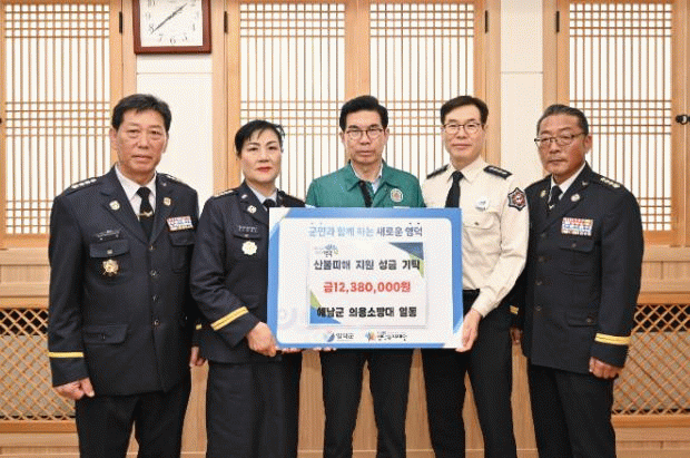 이날 성금 전달식에는 영덕군수, 해남군 의용소방대 연합회장(양동욱, 백미실), 해남읍 남성 의용소방대 대장(류현)등 참석했다.