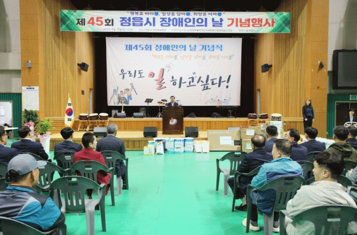 (사)지체장애인협회 정읍시지회(지회장 송현) 주관으로 18일 정읍시 국민체육센터에서 열린 제45회 장애인의 날 기념행사는 장애인시설·단체, 시민 등 1000여 명이 참석한 가운데 성황리에 개최됐다.