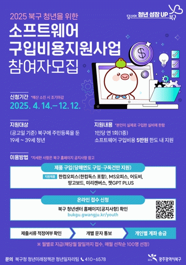 문인 북구청장은 “성장 가능성이 높은 청년들이 구직활동과 자기 계발을 효과적으로 할 수 있는 환경을 조성하기 위해 광주에서 최초로 소프트웨어 구입 비용을 지원하게 됐다”며 “이번 사업에 청년들의 많은 관심과 참여를 바라며 앞으로도 청년이 살기 좋은 북구를 만들기 위해 최선을 다하겠다”고 말했다.