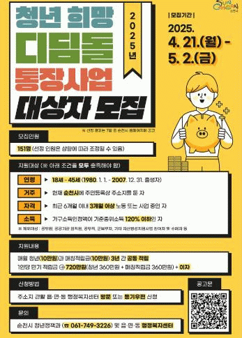기타 자세한 내용과 신청 서식 등은 순천시 누리집 공고문에서 확인할 수 있으며, 문의는 청년정책과 청년지원팀으로 하면 된다.