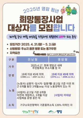 청년 희망 디딤돌 통장사업에 대한 자세한 안내는 영암군인구청년과 청년지원팀에서 한다.