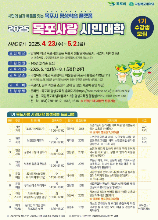 교육은 국립목포대학교 목포캠퍼스와 남악캠퍼스에서 이뤄지며, ▲조경기능사(필기), ▲노인운동지도자, ▲공감과 소통의 말하기 등 총 8개 강좌에 150여 명을 선착순 모집한다.