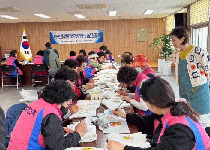 과제교육은 제27회 함평나비대축제를 앞두고 지역 관광 캐릭터인 ‘황박이’를 활용한 ‘나만의 이불 꾸미기’ 수업으로 진행됐으며, 자수와 섬유 페인팅 체험을 통해 회원들의 창의성을 키우고 감수성을 자극하는 시간이 마련됐다.