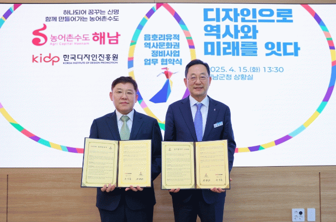 명현관 군수와 윤상흠 한국디자인진흥원 원장 등이 참석한 가운데 15일 해남군청에서 열린 협약식은 해남군이 2024년 문화유산청 공모사업으로 추진하고 있는 현산면 읍호리 유적 역사 문화권 정비 선도 사업의 성공적 추진을 위해 적극 협력해 나가기로 약속했다.