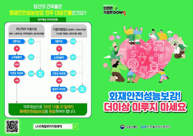특히 화재안전성능 보강 의무대상 건축물은 올해 말까지 보강을 완료해야 하며, 기한 내에 보강하지 않을 경우 해당 건축물의 소유자는 건축물관리법에 따라 처벌받을 수 있다.