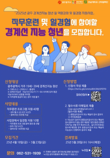 광주광역시는 청년재단, 전남대학교 산학협력단과 손잡고 경계선지능 청년들에게 일경험 기회를 제공하는 ‘경계선지능 청년 일역량 강화 지원 시범사업’을 추진, 오는 5월23일까지 희망자를 모집한다.