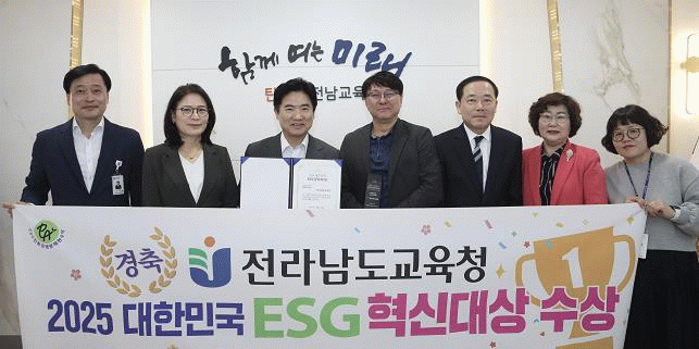 전남교육청은 ESG(환경 · 사회 · 거버넌스) 가치를 교육행정과 학교 교육과정 전반에 체계적으로 내재화해 온 노력을 높이 평가받았다.