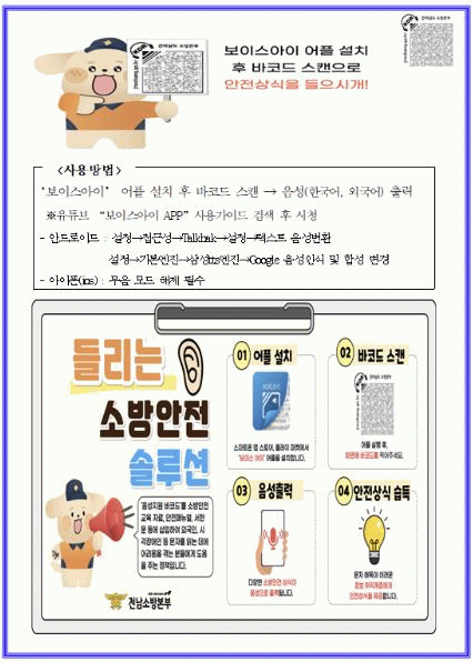보이스아이는 전용 바코드를 통해 종이로 된 안내문이나 홍보물의 내용을 스마트폰에서 음성 또는 다국어로 출력해주는 애플리케이션으로, 강진소방서는 이를 이용해 화재 예방 포스터, 교육자료, 안내문 등 각종 홍보물에 바코드를 삽입하여 배포할 예정이다.