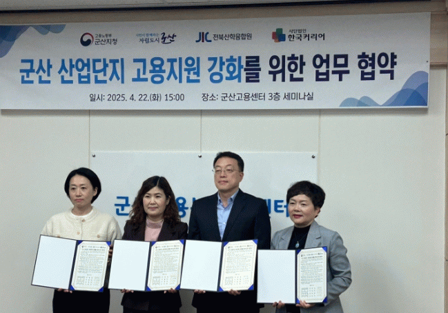 협약식에는 군산고용센터·군산시·사단법인 전북산학융합원·사단법인 한국커리어까지 총 4개 기관이 참석했다.
