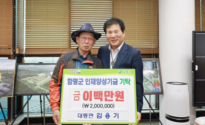 함평군은 22일 “대동면 마량마을에 거주하는 김용기 씨가 이날 인재양성기금에 2백만 원을 기탁했다”고 밝혔다.