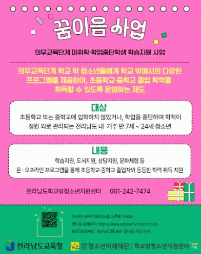 이 보도에 관한 문의는 전라남도학교밖청소년지원센터로 연락하면 된다.