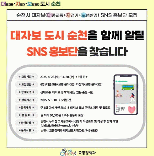 △대중교통+보행 △자전거+보행 분야로 나눠 총 6명으로 구성되며, 순천시 대자보 정책에 대한 홍보뿐만 아니라 직접 대중교통, 자전거를 이용하면서 느낀 점을 홍보콘텐츠, 기사, 영상으로 제작하여 개인 SNS에 게재하는 홍보활동을 추진하게 된다.