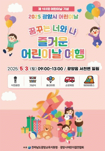 이현주 광양시 아동보육과장은 “어린이와 가족 모두가 즐거운 하루를 보낼 수 있도록 정성껏 행사를 준비하고 있다”며 “시민들께서는 자녀들과 함께 행사장을 찾아 소중한 추억을 만들어 보시길 바란다”고 말했다. 이어 “행사 당일 서천변 인근에 교통 혼잡이 예상된다”며 대중교통 이용을 당부했다.