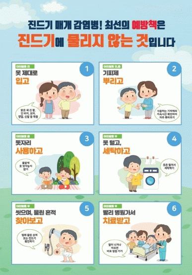 예방수칙으로는 ▲피부를 노출하지 않는 작업복 입기 ▲진드기 기피제 사용하기 ▲풀밭·풀숲은 피하기 ▲귀가 후, 씻고 빨래하기 등이다.