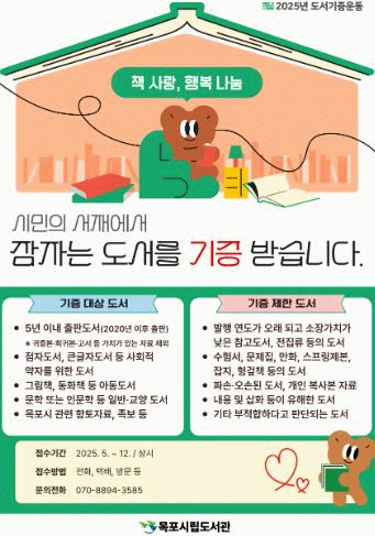 자세한 내용은 목포시통합도서관 누리집에서 확인할 수 있으며, 기증 신청 및 문의는 목포시립도서관 사서팀으로 하면 된다.