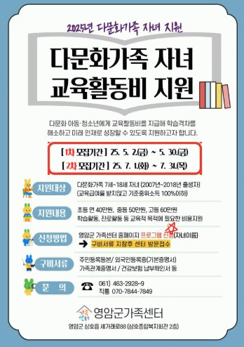 조은정 영암군가족센터장은 “다문화가족 자녀들에게 큰 도움이 될 것으로 기대되는 교육활동비 신청에 많은 가정에서 참여하길 바란다”고 전했다.