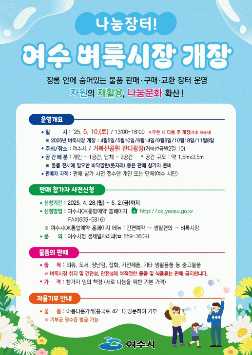 시 관계자는 “가정의 달 5월을 맞아 가족과 함께 나눔과 체험을 즐길 수 있는 특별한 프로그램을 마련했다”며, “여수 벼룩시장이 단순한 중고 거래를 넘어 세대 간 소통과 지역 공동체 화합의 장으로 자리 잡기를 기대한다”고 전했다.