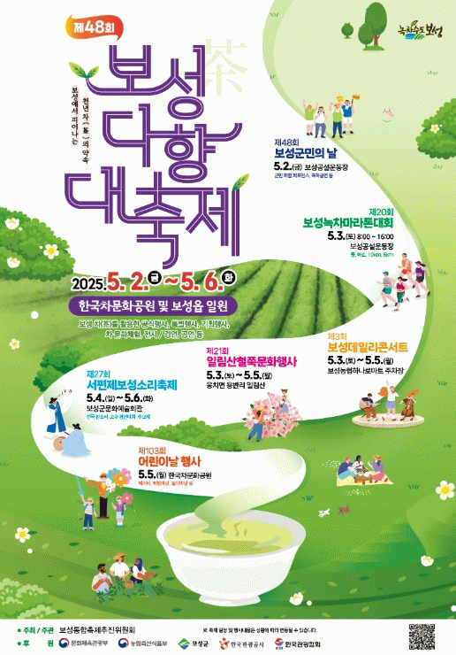 오는 5월 2일부터 6일까지 5일간, 보성군 한국차문화공원 일원에서 열리는 ‘제48회 보성다향대축제’는 ‘보성에서 피어나는 천년 차(茶)의 약속’을 주제로 오직 보성에서만 누릴 수 있는 80여 개의 프로그램을 선보인다.